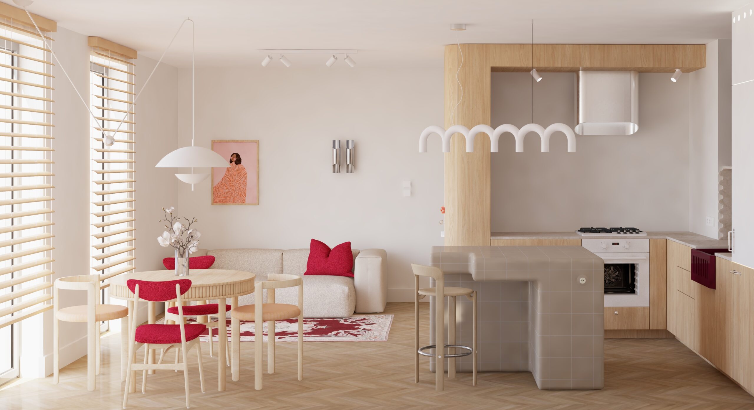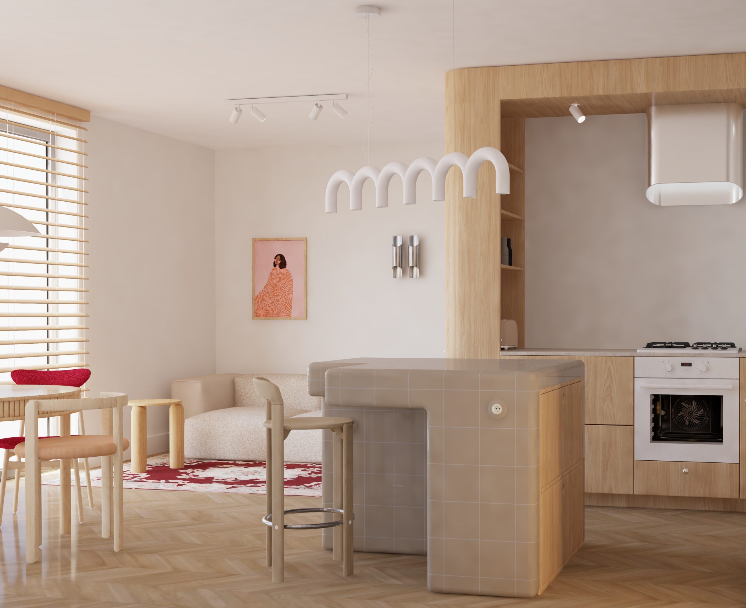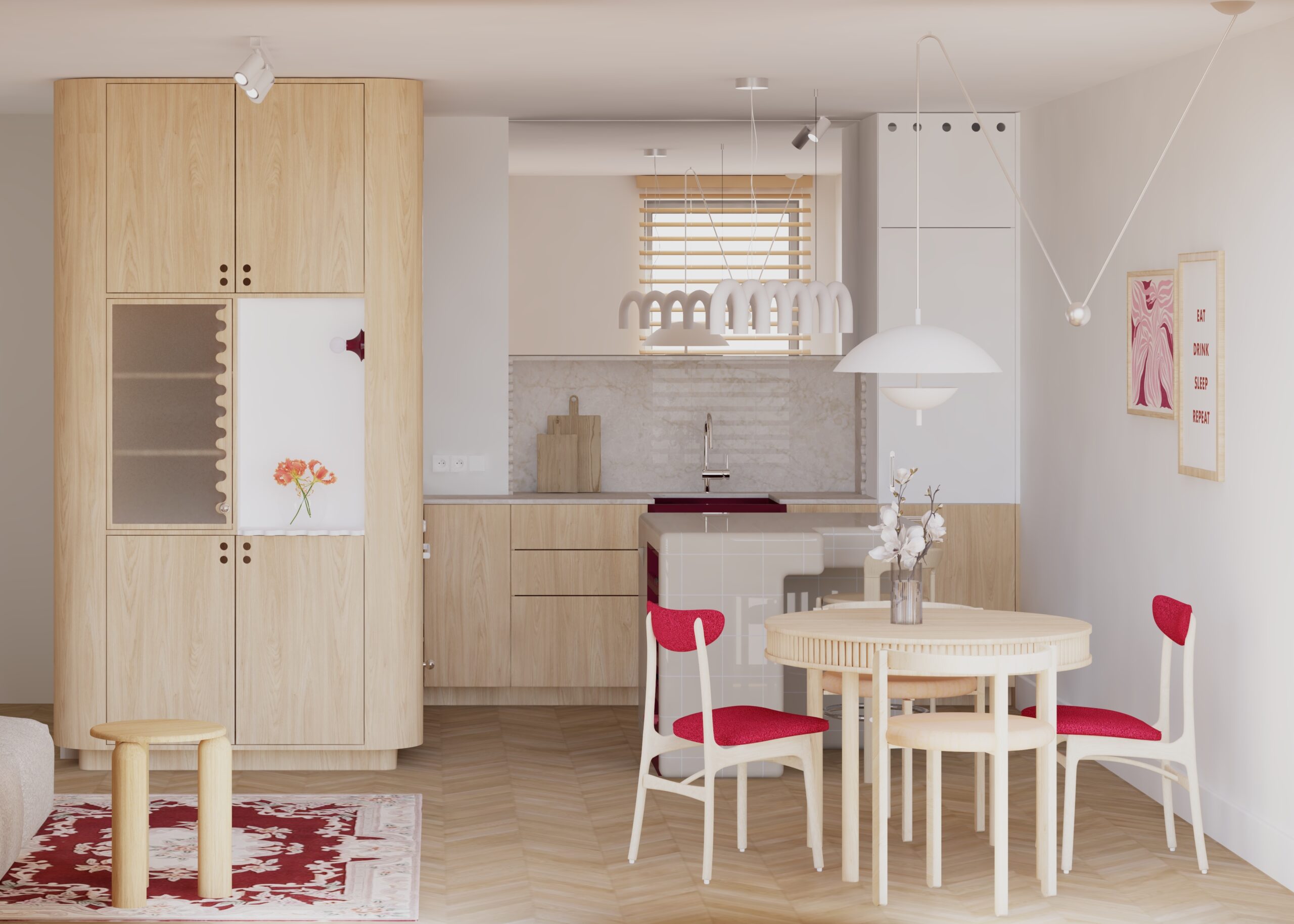 Jasna kuchnia w stylu skandynawskim łączy naturalne drewno, biel i miękkie, zaokrąglone formy, tworząc przytulną i nowoczesną przestrzeń. Charakteru dodają designerska lampa, subtelne detale oraz klasyczna jodełka na podłodze.