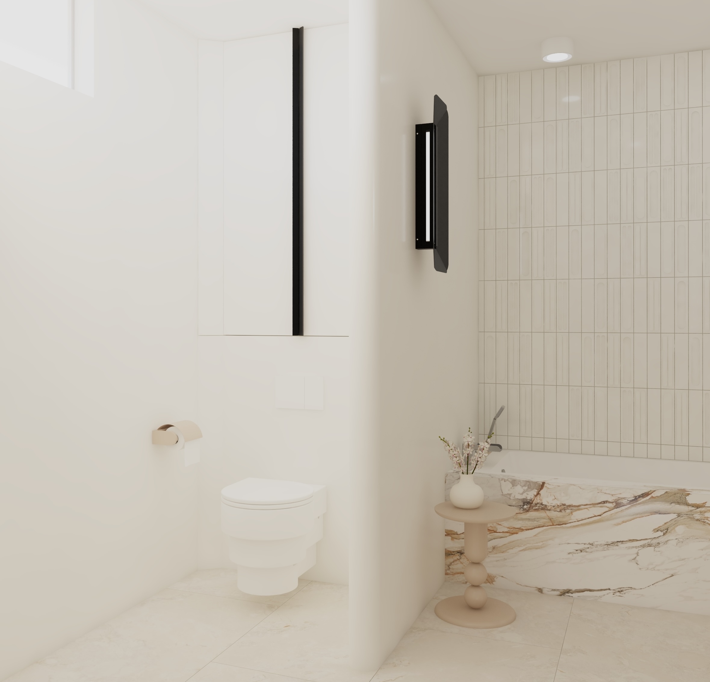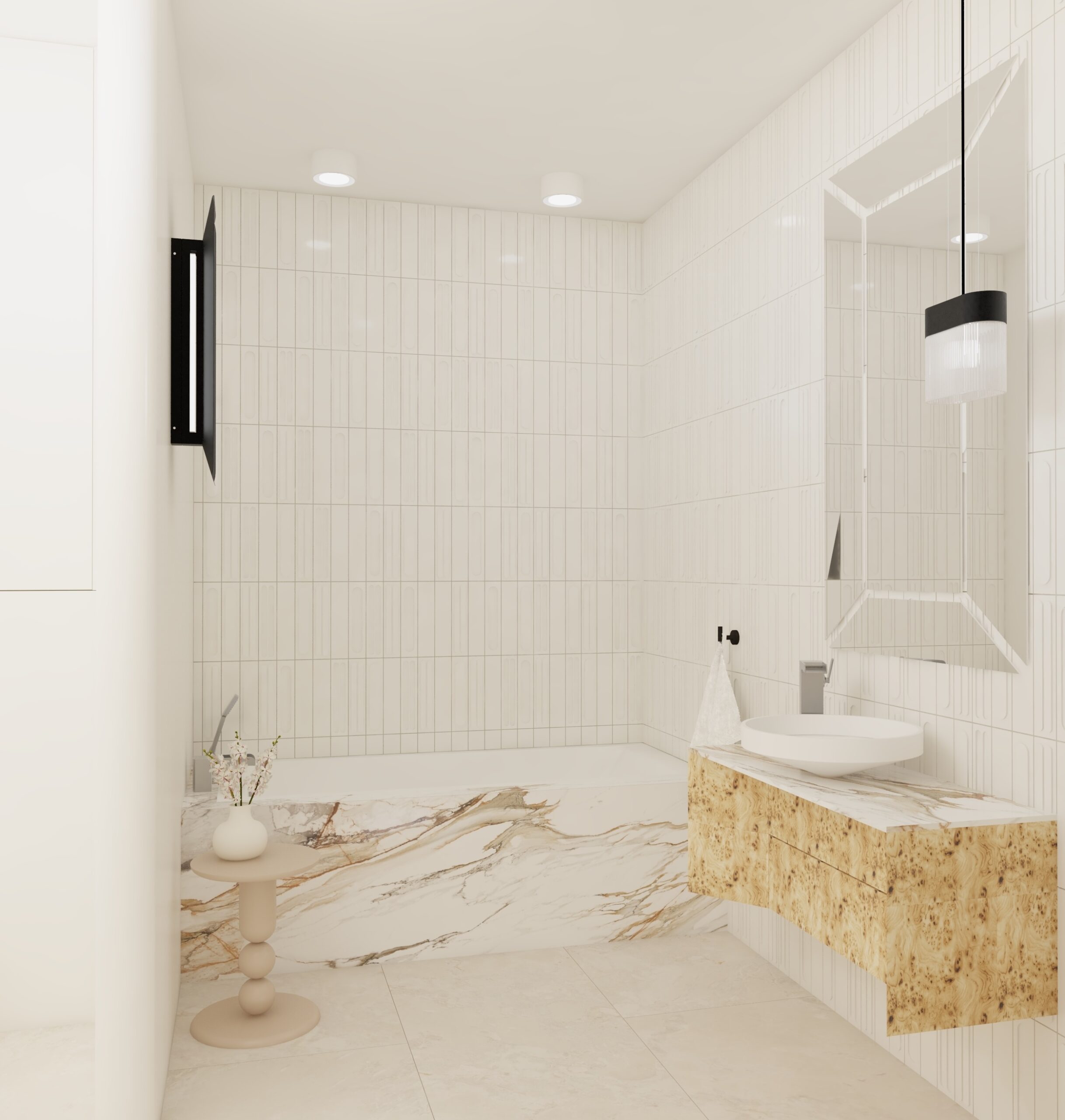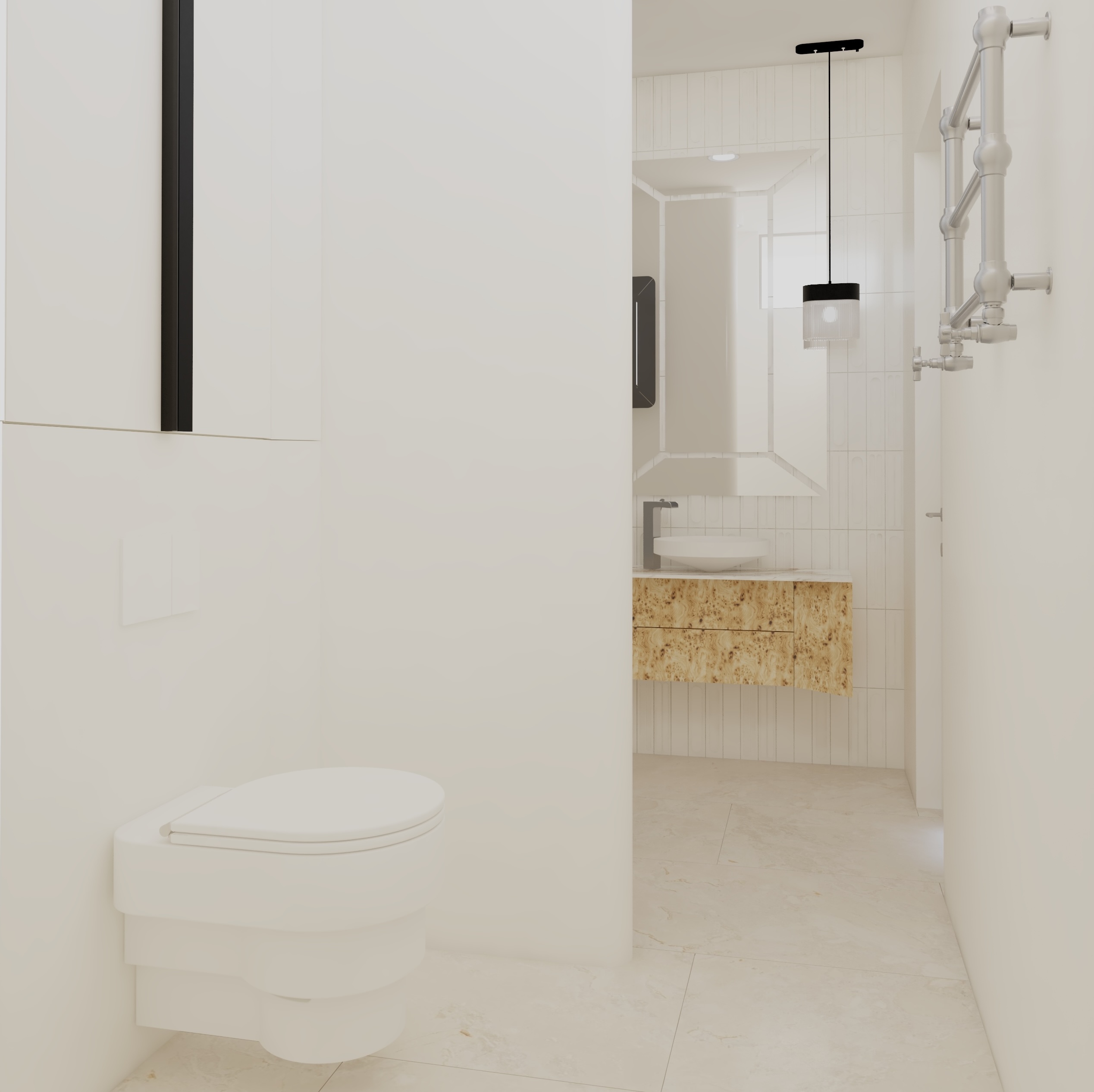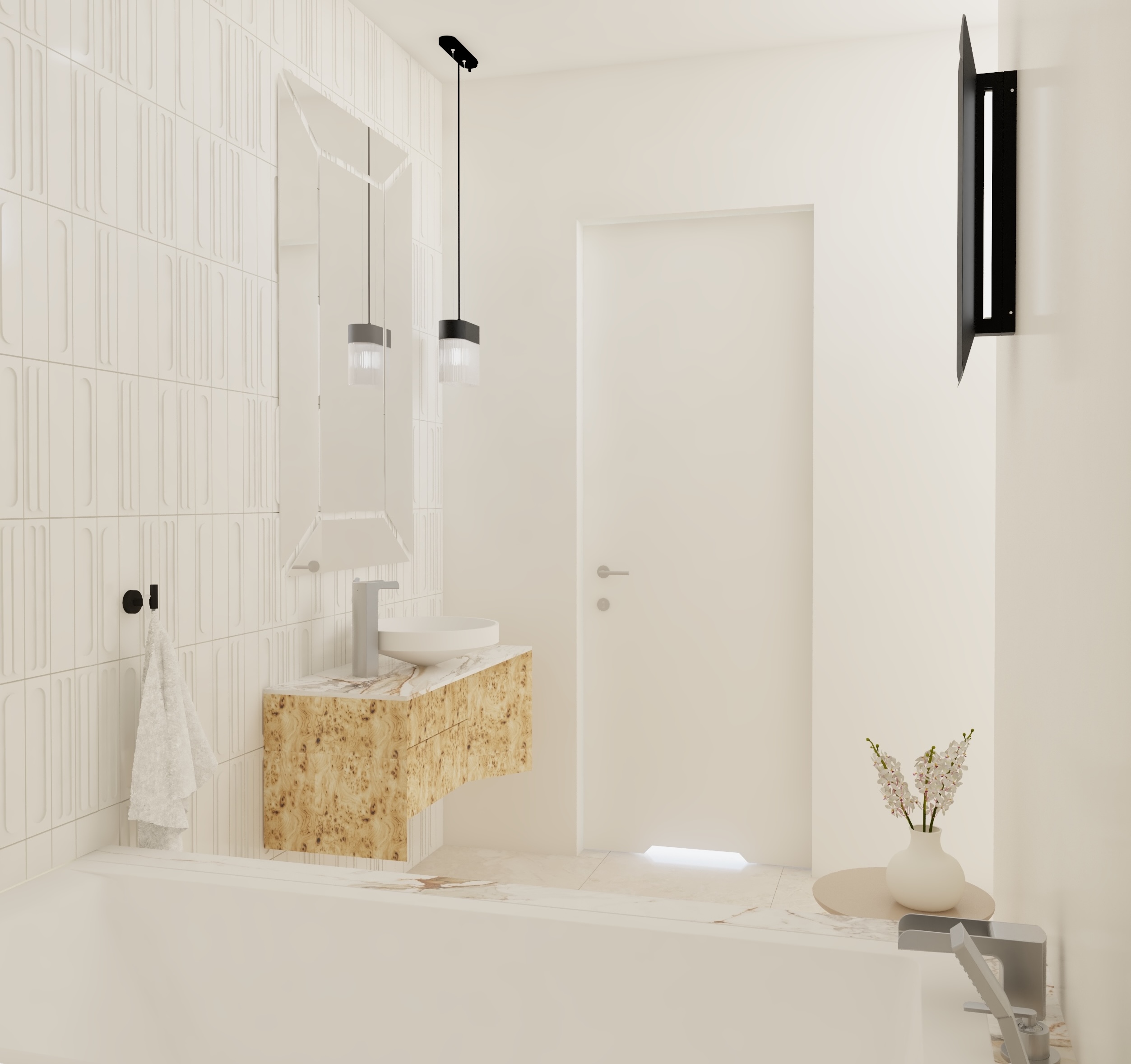 Wyrazisty fornir, wnoszący ciepło do pomieszczenia, przeplata się z geometrycznymi bryłami oraz jasną paletą barw, tworząc przytulną przestrzeń.